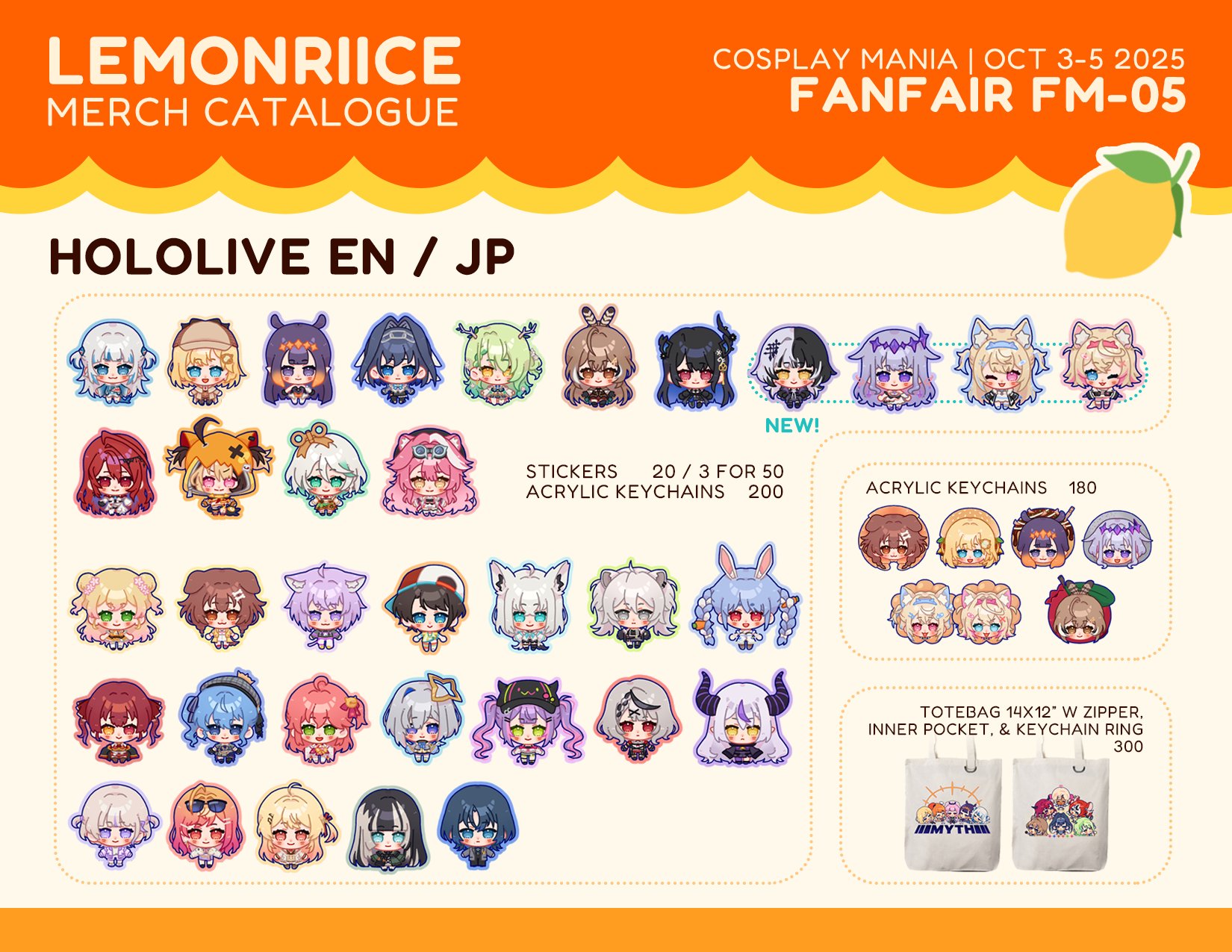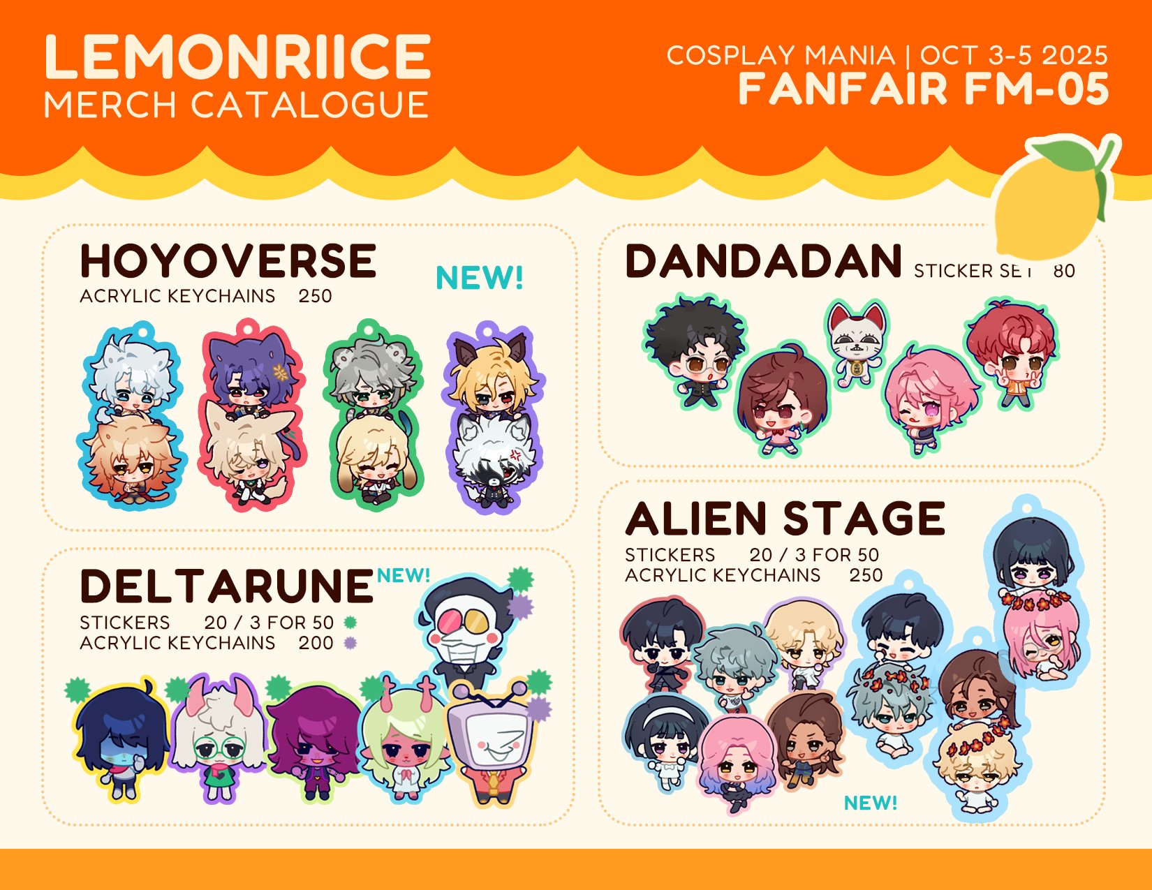 FM05: lemonriice + washidashi + woopsiekai lemonriice ・ washidashi ・ woopsiekai LEMONRIICE CATALOG POST No Reservations LINKS lemonriice straw page Twitter @lemonriice Instagram @lemonriice Vgen @lemonriice MERCH TAGS #Stickers #Keychains #Pins #Cards #Bags #Accessories SERIES TAGS #Hololive EN #Hololive JP #Holostars #Indie Vtubers #Vtubers #Genshin Impact #Honkai Star Rail #Zenless Zone Zero #Dandadan #Deltarune #Alien Stage #Project Sekai #Dungeon Meshi STAMP RALLIES None FM05 ARTISTS lemonriice
